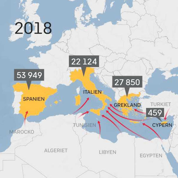 Europas hårdare ton har påverkat migrationsströmmarna. Under första halvåret 2018 kom drygt 45 000 människor till Sydeuropas kuster - omkring fem procent jämfört med hela 2015, då det kom över en miljon.